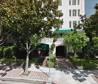 In another scene, Crawford visits Connie Anderson (Martha Hyer), the girlfriend of one of the men Stewart was investigating at her apartment in West Hollywood. Hyer's apartment building is the Colonial House located at 1416 Havenhurst Drive. This building, built in 1930, recently had a three bedroom condo for sale listed for $2,150,000 so it doesn't come cheap. Below is a screenshot of the entrance of the Colonial House, a contemporary view of the entrance and a Bing Bird's Eye view of the building.